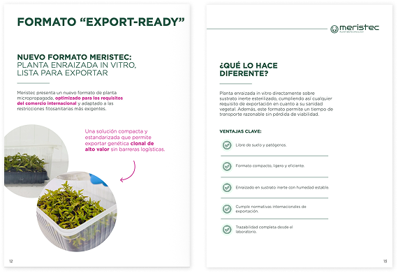 Planta enraizada in vitro sobre sustrato inerte, sin suelo ni patógenos, lista para exportar a cualquier país cumpliendo las normas más exigentes.